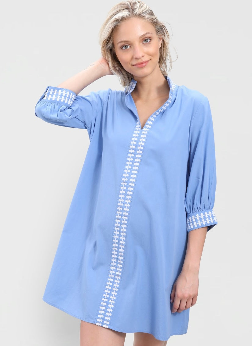 An easy shift silhouette meets thoughtful tailoring in the Campbell Dress. Embroidered detailing adds texture and charm to its front placket and cuffs, while the crisp cotton poplin keeps things polished. Finished with a stand-up collar and 3/4-length sleeves, it’s a versatile pick for everything from breezy errands to casual dinner out.