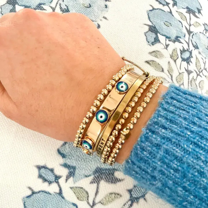 A golden twist on the classic talisman, this Evil Eye Cuff adds a bold layer of shine and protection to your everyday bracelet stack. Sleek and stackable, it’s designed to bring good vibes wherever you go.