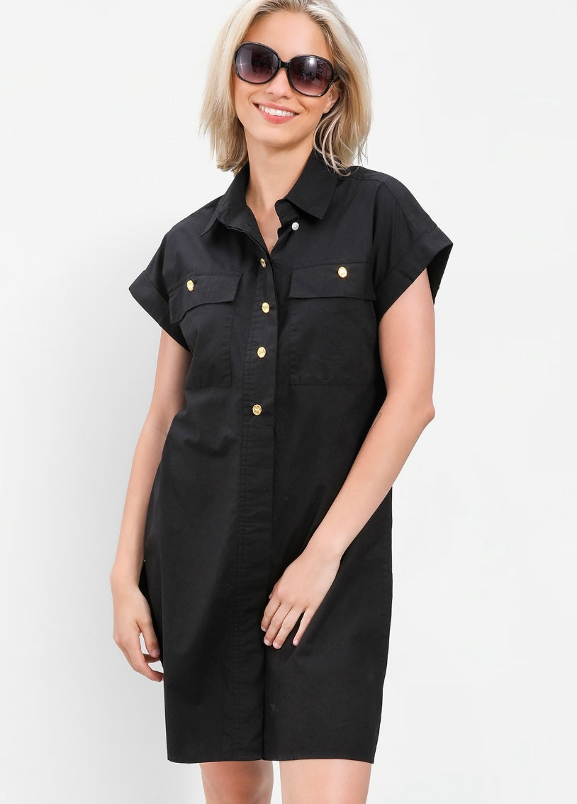 A utility-inspired classic with a polished twist. The Harper Dress features a straight silhouette in crisp black cotton poplin, finished with cuffed short sleeves and gleaming gold buttons. Hidden closures at the chest pockets keep the look clean and elevated.