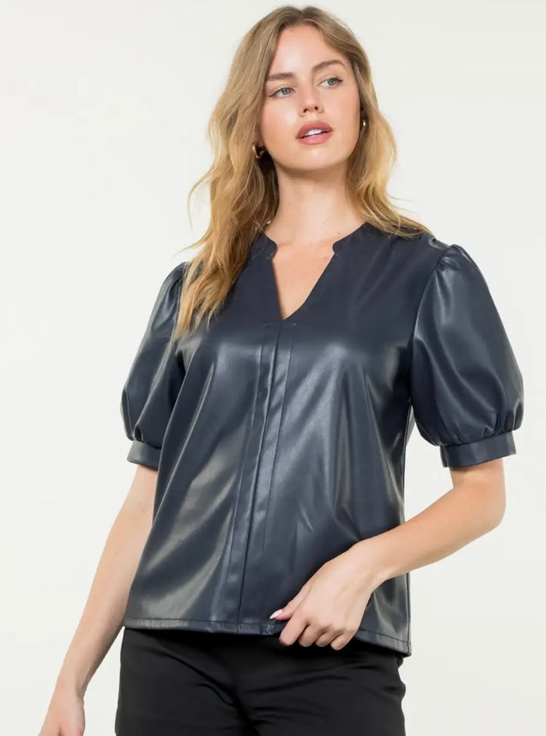 Sleek, structured, and just a little bit edgy. This puff sleeve top in navy faux leather brings unexpected polish to your wardrobe staples. Pair it with denim for a bold everyday look or dress it up for night with tailored trousers and a statement earring.